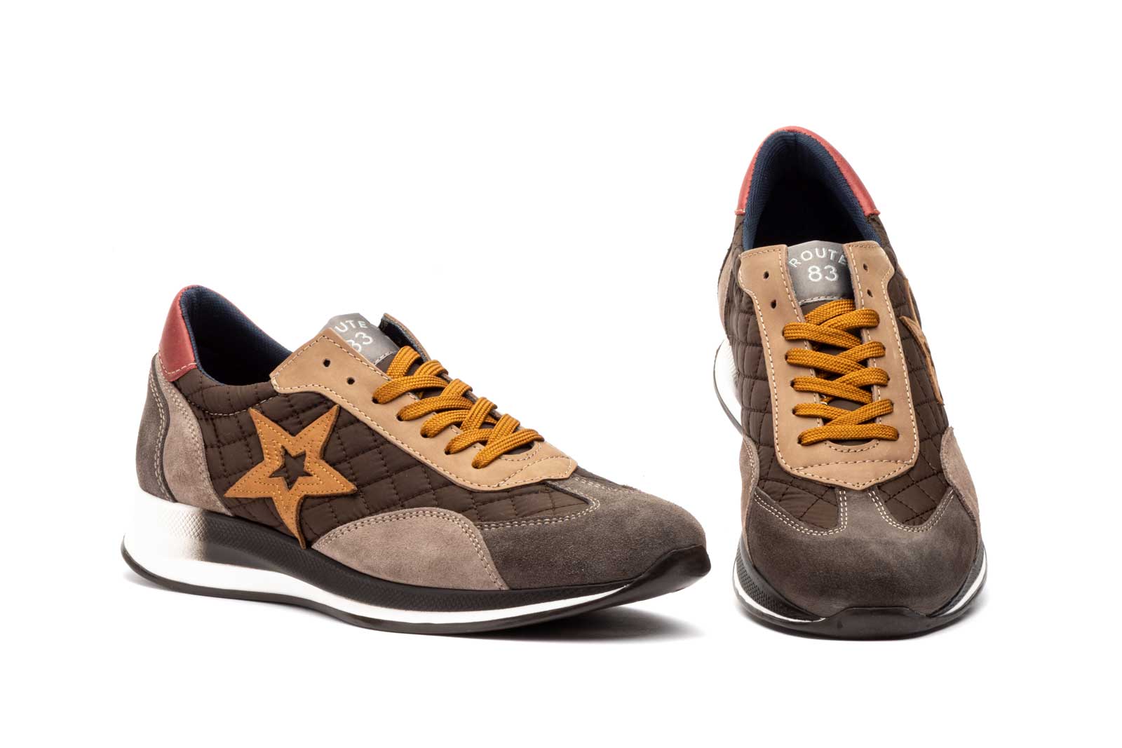 Zapatillas Route 83 para hombre con un diseño vanguardista y urbano. Presentan un corte de piel serraje en tonos grises, complementado con textil acolchado marrón que brinda un aspecto distintivo. Destaca su estrella en cuero marrón y sus cordones amarillos que aportan un toque de color vibrante. La inscripción "ROUTE 83" en la lengüeta refuerza su identidad de marca. Perfectas para quienes buscan estilo y comodidad en su día a día. Suela blanca con detalles en negro para mayor durabilidad y tracción.