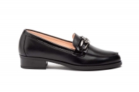 Elegantes zapatos mocasines de la marca Par y Medio, perfectos para el uso diario o eventos formales. Estos zapatos están confeccionados en cuero negro pulido de alta calidad que refleja un brillo sutil. La característica distintiva es el adorno metálico entrelazado en la parte superior, que aporta un toque de sofisticación y modernidad al diseño clásico. La suela plana y el pequeño tacón brindan comodidad al caminar, mientras que el interior acolchado en tono beige ofrece un contraste delicado y un ajuste suave para el pie. Estos mocasines son la combinación perfecta de funcionalidad y estilo.