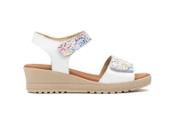 Sandalia de cuña para mujer con diseño moderno y confortable. Fabricada en piel natural blanca con detalles en estampado multicolor texturizado en las correas ajustables de velcro. La plantilla es de material acolchado en tono marrón para mayor comodidad.